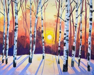 2:00 - 4:30 PM and paint some snowy birch trees. Cost of the event is $42 and includes all painting materials, guided step by step instructions and one drink.